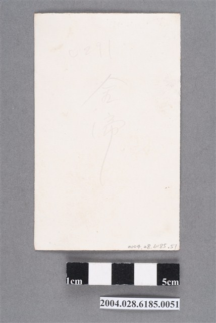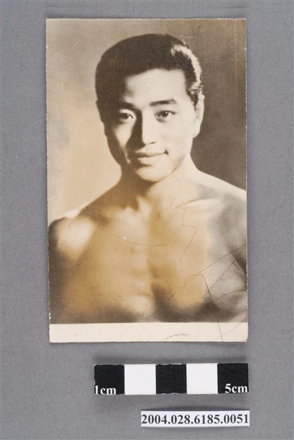 1. 金帝明星黑白沙龍照。相紙材質半身照。金帝短髮,裸路上身,微笑面視前方。照片上有無法辨識兩個字跡。背面有鉛筆寫「金帝」與「C291」字樣。照片表面有些許白點及黑點。2. 金帝,香港演員,相關資料缺乏,僅知曾參與演出《鑽石花》(1953)、《熱情》(1956)及《冷暖人間》(1961)。從《熱情》的報紙廣告上有以女主角及兩位男角色泳裝宣傳的場景研判,此張照片可能是配合該片宣傳所拍攝。香港演員金帝作品甚少,現有網路上資料皆與臺灣演員金帝混為一談。然而臺灣金帝1960年才退伍,演出《揚子江風雲》與《猛龍過江》,並非此金帝。