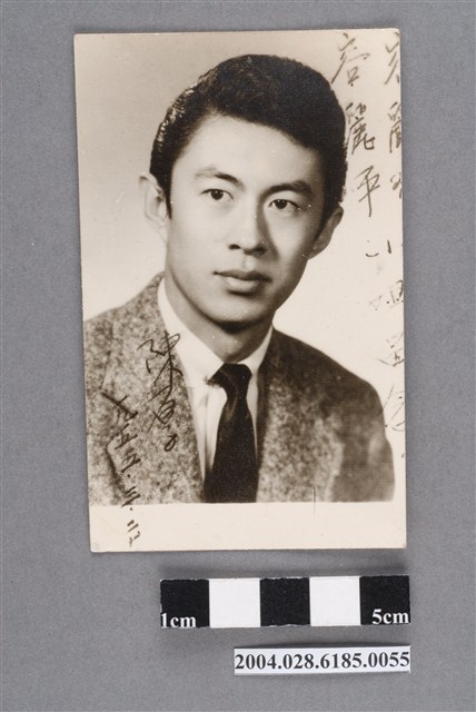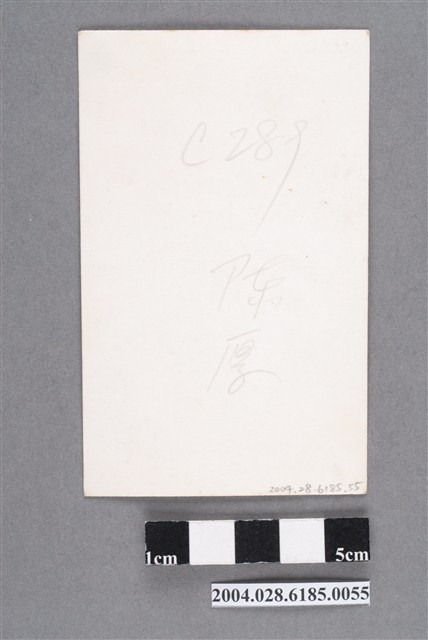 1. 陳厚明星黑白沙龍照。相紙材質頭像照。陳厚身穿厚西裝深色領帶,看向右前方。照片右上方有手寫「容麗平小姐留念」七字(容麗平三字重複有裁切),左下方有簽名:「陳厚一九五五.三.二」以及一個無法辨識的字。背面有鉛筆寫「陳厚」與「C289」字樣。照片上白點較多,也有幾道細黑線條。2. 陳厚本名陳尚厚,為香港影星,自1953年至1970年間為電懋及邵氏等公司拍攝六十餘部電影,有「喜劇聖手」的稱號。第二任妻子為影星樂蒂。