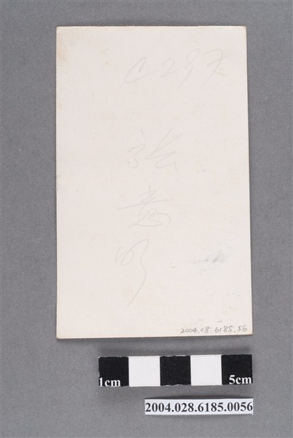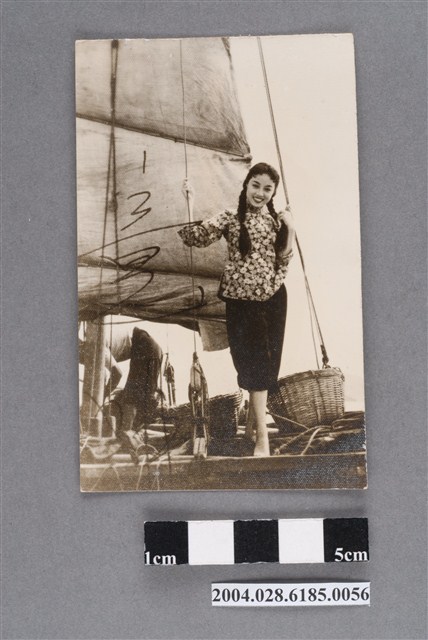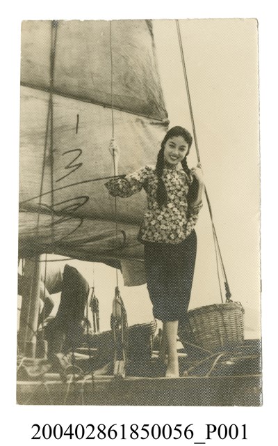 1. 張意明黑白明星照。相紙材質,直式《漁歌》場景工作照。張意明紮兩條長辮子,身穿碎花短棉襖,深色七分棉長褲(應為飾演角色服裝),微笑站在舢舨上的帆前,右手拉著船帆繩,左手拉著辮子,雙腳前後交叉。左後方有竹簍,又後方有一彎腰工作男子。照片上有「意明」二字簽名。背面有鉛筆寫「張意明」與「C297」字樣。照片有不少細白點。2. 張意明為香港影星,1953年至1960年間曾參與演出《毒蟒情鴛》、《風雨桃花村》、《漁歌》(1953年出品,卜萬蒼導演,林黛、嚴俊主演)等十餘部影片。此張照片為《漁歌》場景上拍攝的工作照。