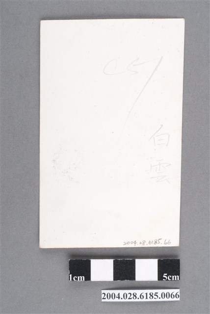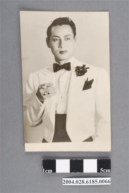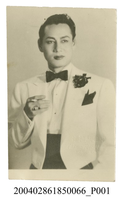 1. 白雲明星黑白沙龍照。相紙材質半身照,白雲著白色西裝禮服看向左前方,戴蝴蝶結領帶,左肩戴著花,左胸口有手帕裝飾。右手戴著寶石戒指,夾著煙,橫在胸前。照片右下方有一條空白相紙,有「照相館」三字與英文鋼印。照片乾淨無痕。 2. 白雲廣東人,本名羅維漢,也以羅漢為名,1939至1941年間在國華影業公司,與周璇、周曼華合作演出多部電影,如《天涯歌女》,有「銀壇驕子」、「東方范倫鐵諾」等稱號。1947年赴香港演出數十部粵語、廈語及國語片。