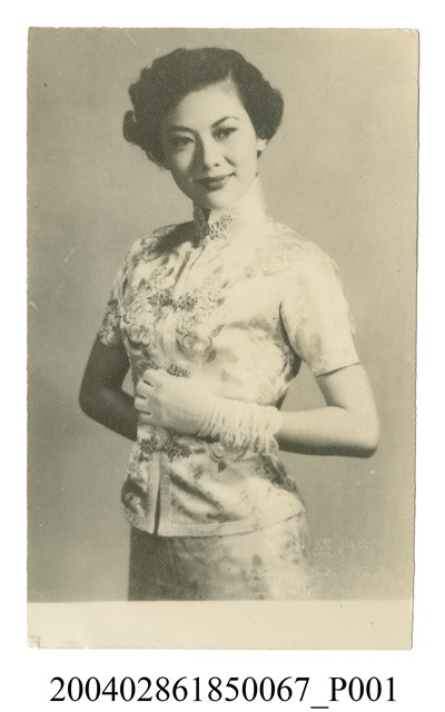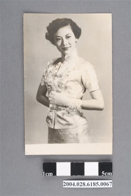 1. 鷺紅明星黑白沙龍照。相紙材質半身照。鷺紅微側身,短髮面露自信微笑。身穿兩截式短旗袍,右手置於身後,左手橫在腰前,手臂以紗巾包裹。下方有一條空白相紙。照片乾淨無痕。2. 鷺紅為廈門人,原名曾谷蘭,拍攝香港生產第一部廈語片《相逢恨晚》(1947年),1948年移居香港拍攝她的第一部國語電影《一代梟雄》(1948年)。相繼主演了《破鏡重圓》、《兒女情深》等20多部廈語片