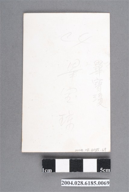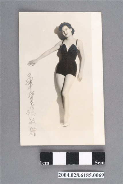 1. 畢寶瓊明星黑白沙龍照。相紙材質,畢寶瓊全身穿深色連身胸部尖葉形狀有肩帶設計泳衣,似站在牆前,雙腿微微交疊,右手貼牆45度伸出。手下方有「畢寶瓊敬贈」之簽名。右方有一條相紙空白處。背面有鉛筆寫「畢寶瓊」與「畢宝琼」字樣,以及「C4」字樣、照片狀況良好。2. 畢寶瓊為50年代香港演員,曾參與《白花蛇》 (1954) 、《死亡在線》 (1956)與《太平山下》 (1956)等影片演出。其他資訊不詳。