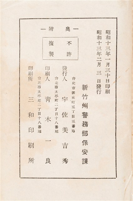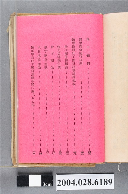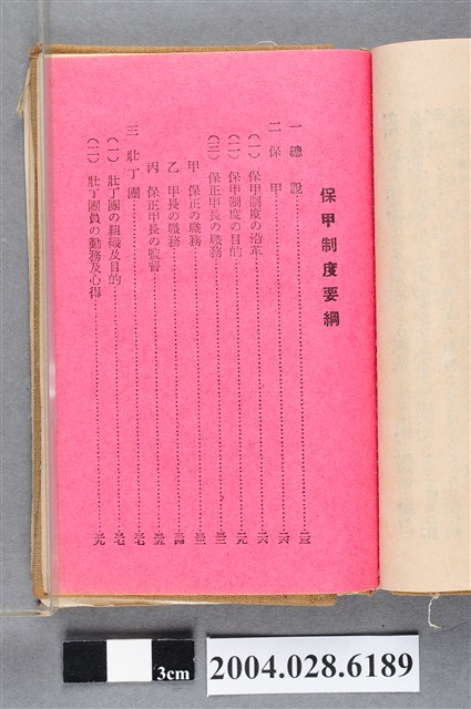 1.本件為《保甲役員壯丁團員訓練手牒》,內容記載日治時期臺灣保甲歷史沿革、目的和職務,壯丁團目的和勤務等等。作為保長、甲長、壯丁團的訓練教材。2.日治時期以警察官吏派出所為中心,構築警察在地方上的權力空間,派出所警察則以保甲為耳目,以壯丁團為輔助力量,有效的維持地方社會的秩序。