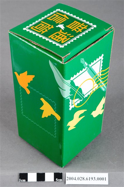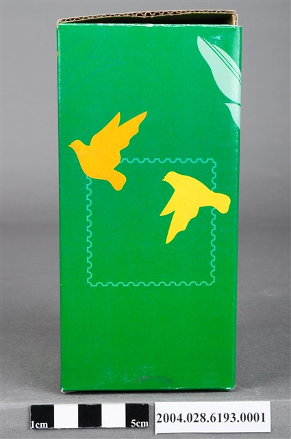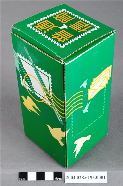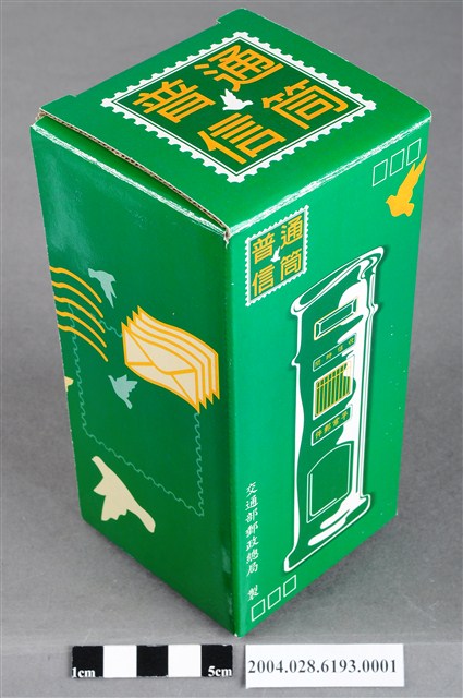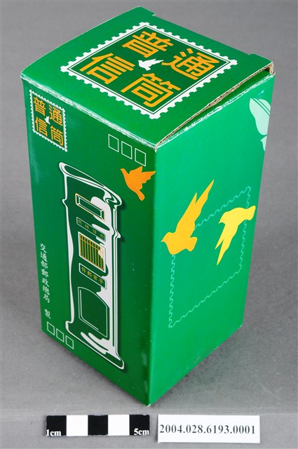 本物件為2002年交通部郵政總局製普通信筒紙盒,紙盒底色為綠色,上面印有郵筒的插圖,左上角印有普通信筒的郵票圖案,左下角印有交通部郵政總局製的字樣,底部印有郵局的符號及2002。