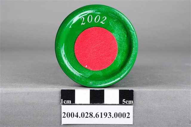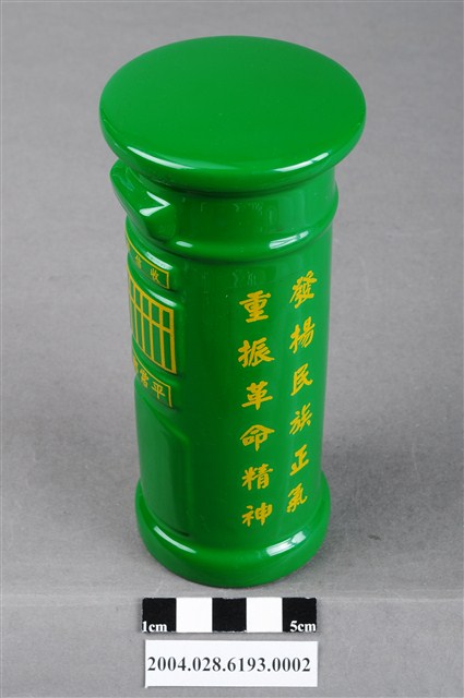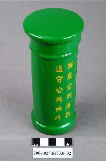 本物件為 2002年交通部郵政總局製普通信筒存錢筒,郵筒為綠色,上面印有收信時間及平常郵件的字樣,底部有個紅色的蓋子及2002的字樣,側邊印有「發揚民族正氣 重振革命精神」及「維護公共道德 遵守公共秩序」。