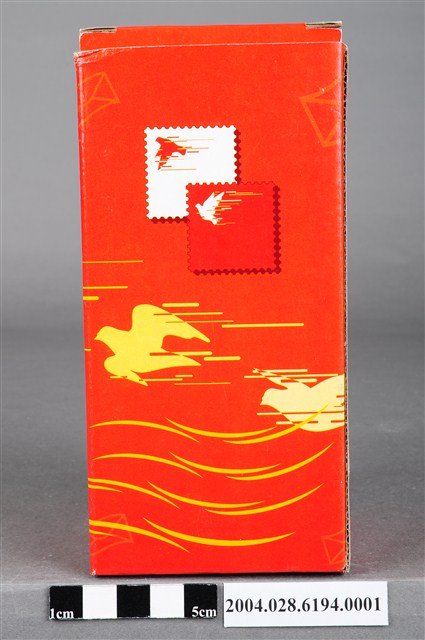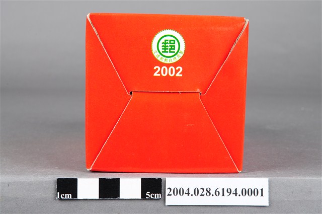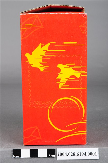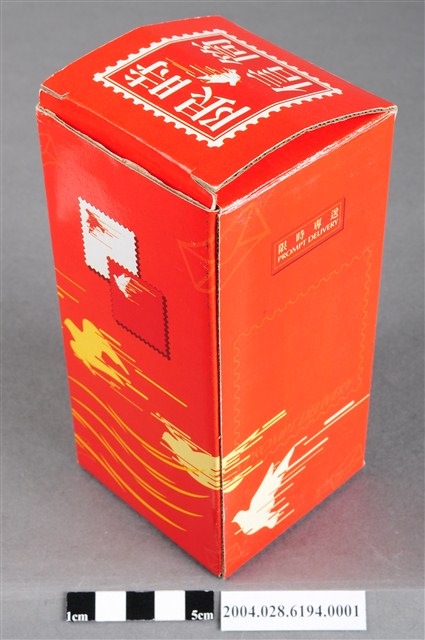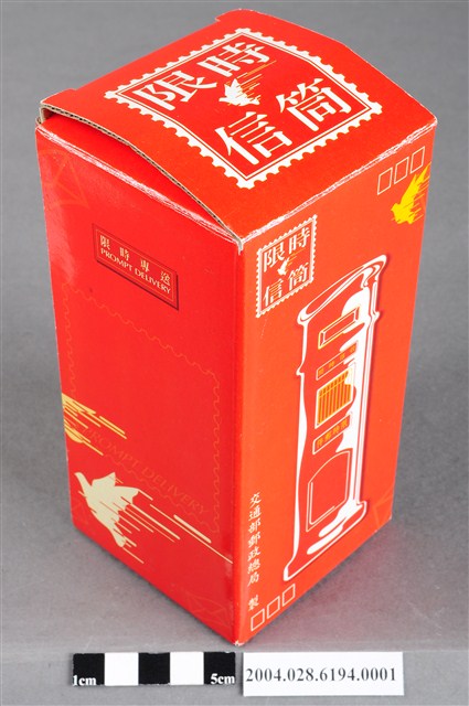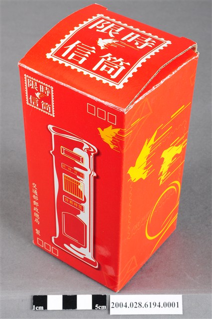 本物件為2002年交通部郵政總局製限時信筒存錢筒紙盒,外盒底色為紅色,上面有郵筒的插圖,盒蓋上印著一個郵票圖案寫著限時信筒,正面左上角一樣有一個。