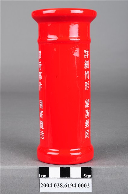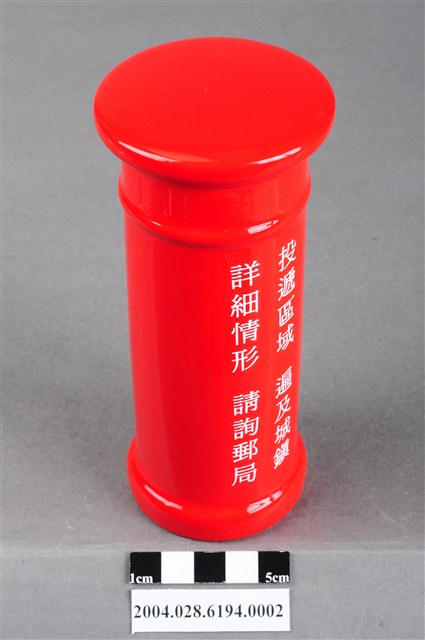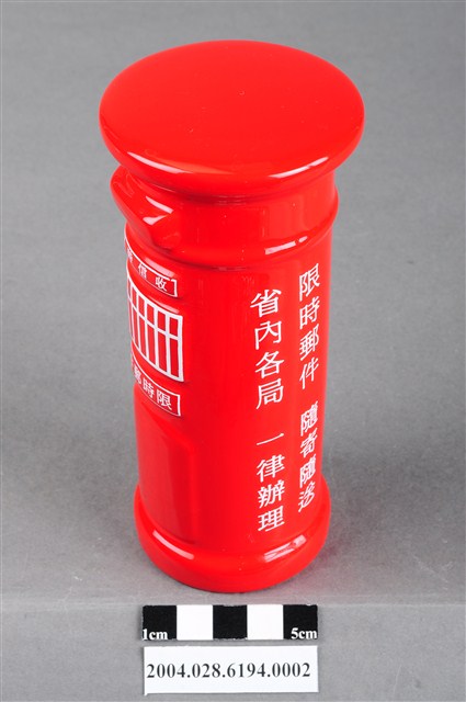 本物件為2002年交通部郵政總局製限時信筒存錢筒,盒內的郵筒模型為紅色,郵筒正面印著收信時間及限時郵件的字樣,底部則有存錢筒開口及2002字樣。
