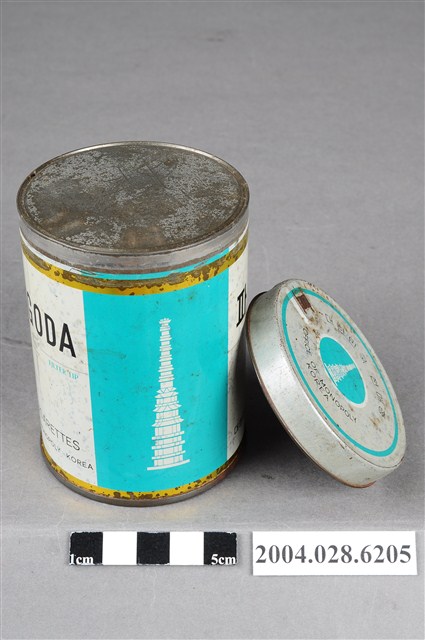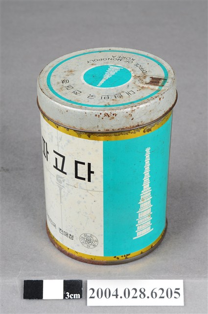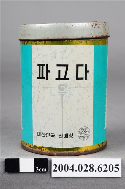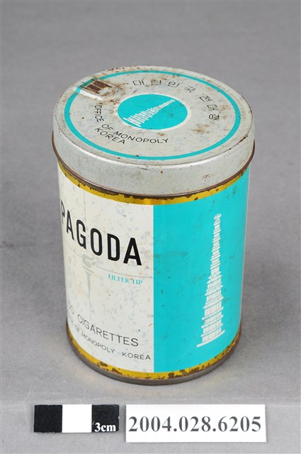 本物件為PAGODA鐵罐。罐身為圓柱體,顏色為兩白與兩淡藍色塊相間。白色塊一面文字為英文,有PAGODA、FILTER TIP、50 CIGARETTES和OFFICE OF MONOPOLY KOREA,另一面則是韓文字體。兩淡藍色色塊上有白色塔狀圖案。瓶蓋有白色塔狀圖案和OFFICE OF MONOPOLY KOREA與韓文字體。