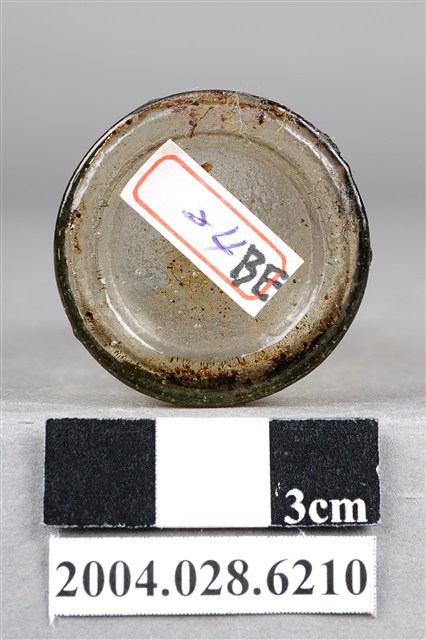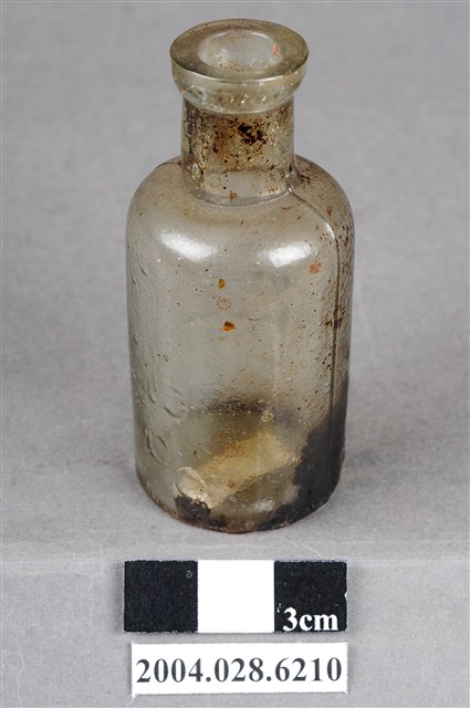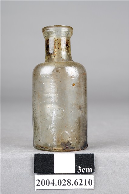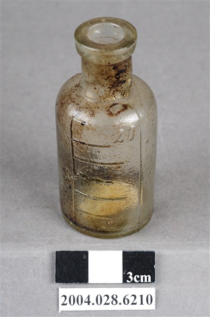 1.本件玻璃藥瓶,透明玻璃製,圓柱形瓶身,瓶身上有浮凸的刻度標示,靠近瓶肩的刻度旁有「20」的浮凸數字,瓶頸偏窄,瓶口外沿有一圈玻璃加厚突出,瓶身玻璃佈滿氣泡及顆粒,瓶子內壁及底部有深色的藥劑殘留痕跡,瓶底貼有一張白底紅框的長方形標籤,上面有「24BE」手寫字樣。2.日治時代政府大力扶植西醫,建立西醫制度,培養西醫人才,西醫遂取代漢醫成為臺灣醫療主體。3.日治時期之前,臺灣即有以坩鍋爐吹製玻璃民生用品,惟規模不大,日治時代起便陸續有日人來臺投資設廠或協助經營玻璃產製及內外銷,1939年日本人在新竹赤土崎設立臺灣高級硝子工業株式會社,以坩鍋窯量產醫療用玻璃器皿及玻璃理化儀器,並培養吹製人才,帶動了整個產業的發展,二戰後因玻璃用品需求大增,1950-1970年民間玻璃產業十分蓬勃,1970年後因石化工業興起,塑膠製品普及、產業外移等因素而沒落。