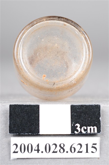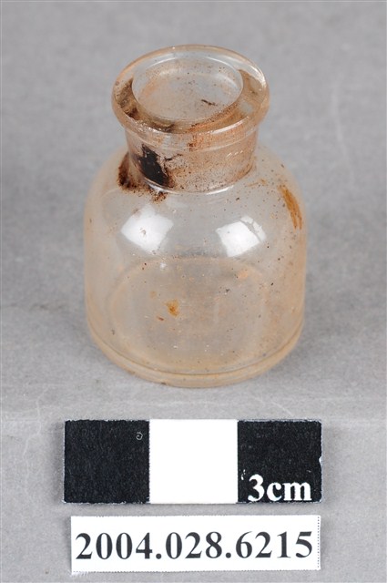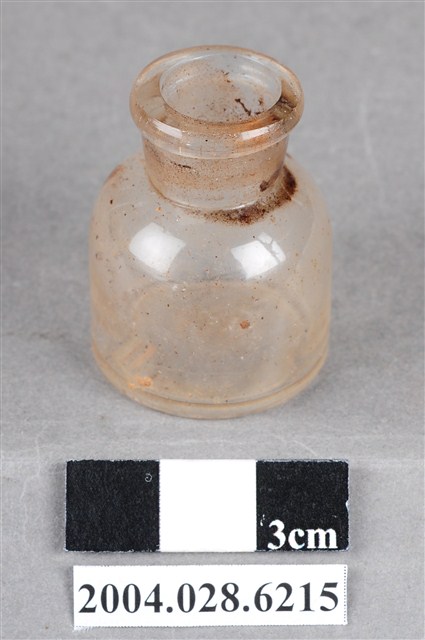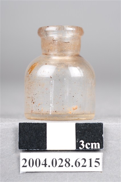 1.本件玻璃廣口藥瓶,透明玻璃製,玻璃有少許氣泡與顆粒,圓柱形瓶身,底部直徑約3公分,斜瓶肩,瓶頸至瓶口處外擴,瓶口寬廣,唇圈圓潤,瓶身內壁分佈許多茶色點狀及片狀污漬,瓶頸內壁有一處明顯的深棕色不規則片狀污漬。2.日治時代政府大力扶植西醫,建立西醫制度,培養西醫人才,西醫遂取代漢醫成為臺灣醫療主體。3.日治時期之前,臺灣即有以坩鍋爐吹製玻璃民生用品,惟規模不大,日治時代起便陸續有日人來臺投資設廠或協助經營玻璃產製及內外銷,1939年日本人在新竹赤土崎設立臺灣高級硝子工業株式會社,以坩鍋窯量產醫療用玻璃器皿及玻璃理化儀器,並培養吹製人才,帶動了整個產業的發展,二戰後因玻璃用品需求大增,1950-1970年民間玻璃產業十分蓬勃,1970年後因石化工業興起,塑膠製品普及、產業外移等因素而沒落。