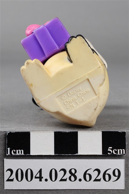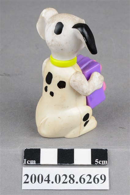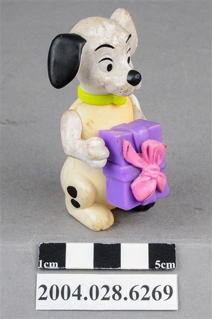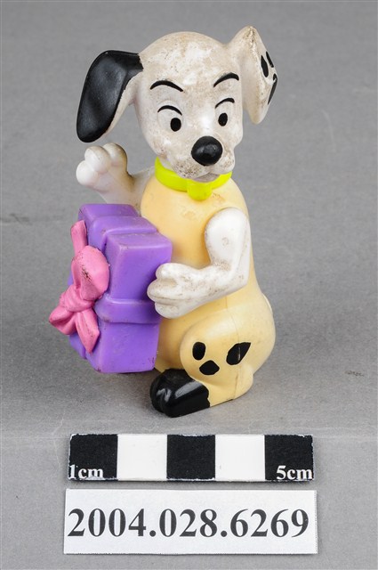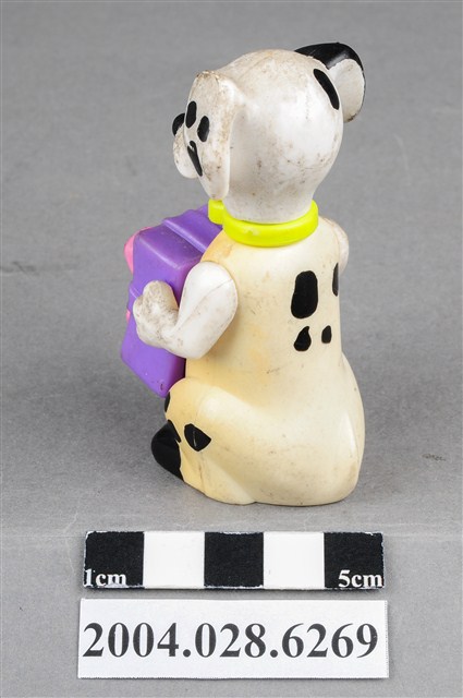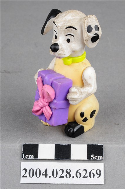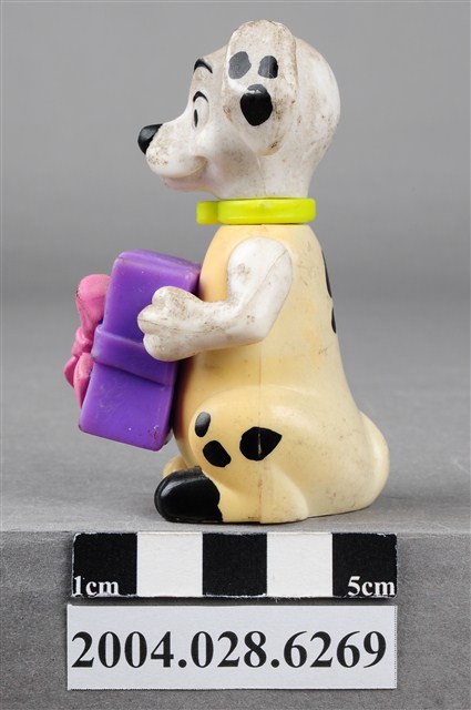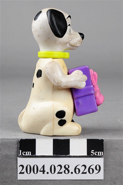 1.本物件為麥當勞101忠狗禮物盒玩具,材質為塑膠,外表為立姿大麥町犬拿著紫色禮物盒,長方形禮物盒上繫著紫色絲帶與粉紅色蝴蝶結,大麥町犬左耳上有3個黑色斑點,右耳背為黑色,頭後有1個黑色斑點,頸部有黃色項圈,右後腿有2個黑色斑點,左後腿有3個黑色斑點,腳趾為黑色,物件底部有「Disney」、「China」、「Chine」、「SN 1-1」字樣,物件上半部有汙漬,下半部黃化。