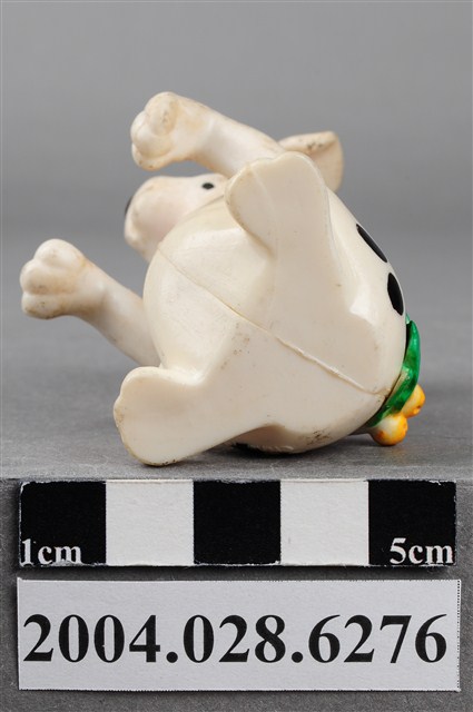 1.本物件為麥當勞101忠狗粉色項圈玩具,材質為塑膠,外表為立姿大麥町犬,大麥町犬臉上有六個黑色斑點,頭後有五個黑色斑點,左右耳各有兩個黑色斑點,頸部有粉色項圈,背上有六個黑色斑點,左右後腿各有四個黑色斑點,右後腿上有「Disney」、「China」、「KH」、「Chine」字樣,尾巴上繫有綠色冬青葉與黃色冬青果。