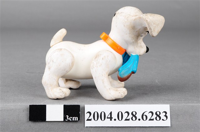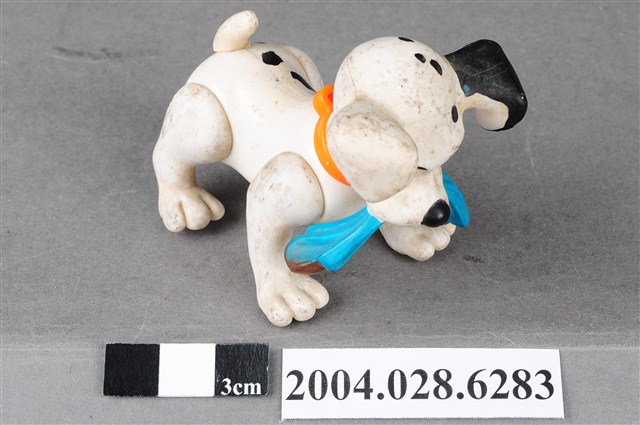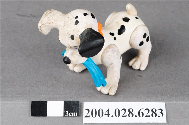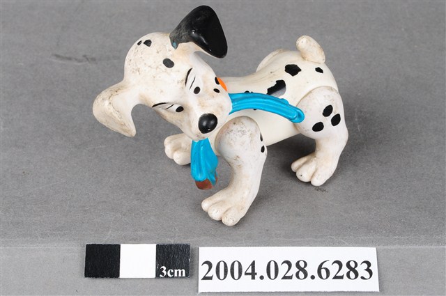 1.本物件為麥當勞101忠狗咬藍色毛巾玩具,材質為塑膠,外表為站姿大麥町,犬嘴上咬著藍色毛巾,頭略為向下,大麥町犬頭部有七個黑點,左耳背為黑色,頸部有橘色項圈,左前腿有兩個黑色斑點,背上有五個黑色斑點,左後腿上有三個黑色斑點,右後腿上有「Disney」、「China」、「Chine」、「GG 1-02」字樣。