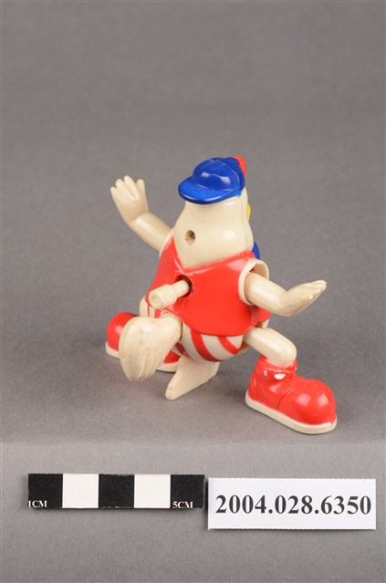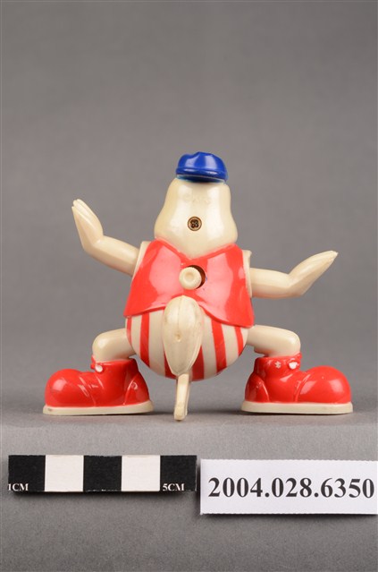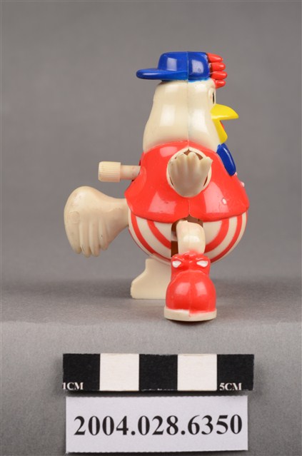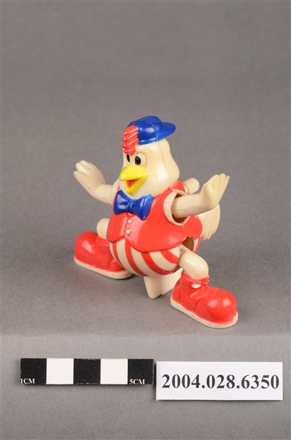 1.本物件為速食餐廳肯德基玩具,塑膠材質。該物件乃肯德基奇奇雞之塑膠玩具,主要配色為白、紅、藍色。該玩具外觀為一隻頭戴藍色帽子的雞,身著紅色背心、紅白條紋短褲,脖子繫有藍色領結,其呈現大字形姿勢。其背面可見「KFC」字樣。