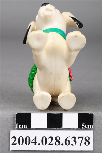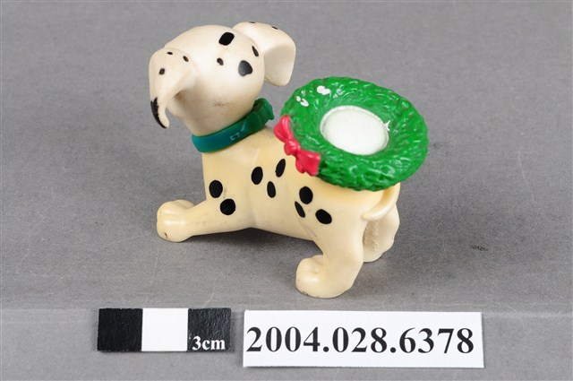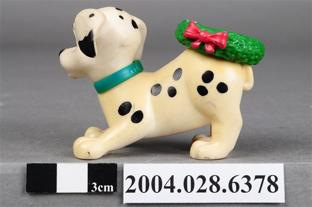 1.本物件為101忠狗之咬皮鞋玩具,為具黑色斑點1.底色為白色的大麥町,脖子上戴著紫色項圈,趴在地上,頭向右擺,嘴裡咬著一隻暗紅色的皮鞋,左右後腳內側有「©Disney 」及「China KH Chine」字樣,整體帶有污漬,身體部分則有泛黃痕跡。