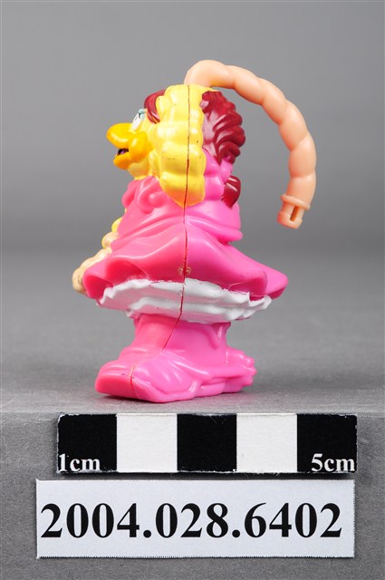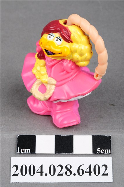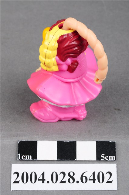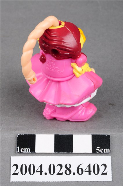 1.本物件為速食餐廳麥當勞玩具,塑膠材質。該物件乃麥當勞大鳥姐姐套繩師之塑膠玩具,主要配色為粉紅、黃色。該玩具可見大鳥姐姐身著粉紅色連身洋裝及靴子,手持繩索,頭上有粗繩索。其背面可見「1995」、「McD. Corp.」、「MACAU」、「CW」字樣。