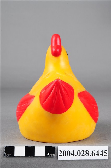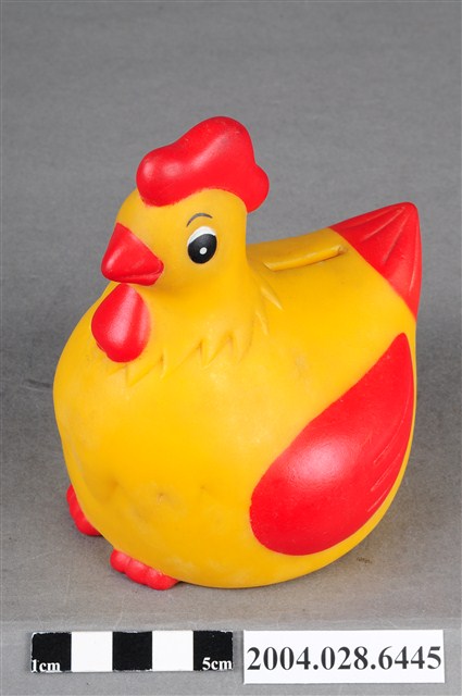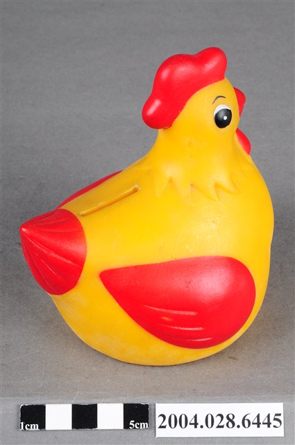 1.本物件為購買幼兒多力奶粉所贈送之公雞造型存錢筒,雞冠、嘴、翅膀、尾羽及腳為紅色,眉毛與眼睛為黑色,其餘皆為黃色,上方有一投錢孔,底部有一黃色蓋子將洞口關上,並於一旁註明「幼兒多力敬贈不得轉售」字樣。