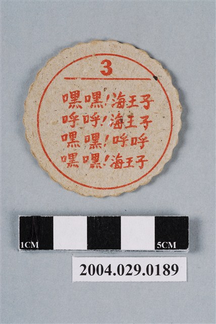 1.本物件為海王子尪仔標,為圓形花邊紙質卡牌,正面中央圖案為動畫海王子內主角海王子,藍短髮,黃衣,披有紅色披風,手拿奧利漢短劍,場景於海草中,畫面中央有「海王子」藍色字樣,正面上右下左各分別有「撲克牌-菱形」、「士」、「猜拳-石頭」、「傌」圖案與字樣,「士」為藍字,「傌」為字;背面中央以紅色蓋印海王子歌詞,內容有「3」、「嘿嘿!海王子 呼呼!海王子 嘿嘿!呼呼! 海王子」字樣。