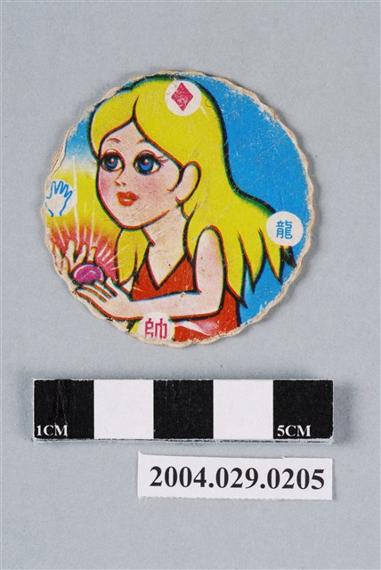 1.本物件為海王子與海豚露嘉尪仔標,為圓形花邊紙質卡牌,正面表面有些龜裂,中央圖案為動畫海王子內主角海王子與海豚露嘉(另有譯名海豚露卡),海王子為綠短髮,身穿白衣,披有紅色披風,左手持奧利漢短劍,海豚露嘉身體為白色,頭上戴有飾品,場景於海洋中,正面右上有「海王子」藍色字樣,正面上右下左各分別有「猴」、「帥」、「猜拳-剪刀」、「撲克牌-梅花」圖案與字樣,「猴」為藍字,「帥」為紅字;背面中央圖案為動畫海底小遊俠內人魚妞妞,金長髮,藍眼,身穿紅衣,手拿圓形物體,背面上右下左各分別有「撲克牌-菱形」、「龍」、「帥」、「猜拳-布」圖案與字樣,「龍」為藍字,「帥」為紅字。
