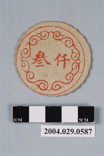 1.本物件為恐龍救生隊之怪獸尪仔標,為圓形花邊紙質卡牌,圖案裁切不完整,正面圖案上下分別為卡通恐龍救生隊的怪獸與(萬能號(BornFree),左上方印有「怪獸」藍色字樣,由右上、右下、左下、左上各圖案與字樣分別是紅字「象棋-帥」、「猜拳-剪刀」、藍字「十二生肖-牛」、「撲克牌-黑桃」;背面圖案為紅色蓋印有圓圈內有裝飾之「參仟」圖案及字樣。本件與登錄號2004.029.0589藏品相同。