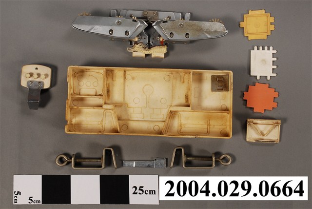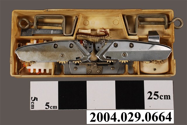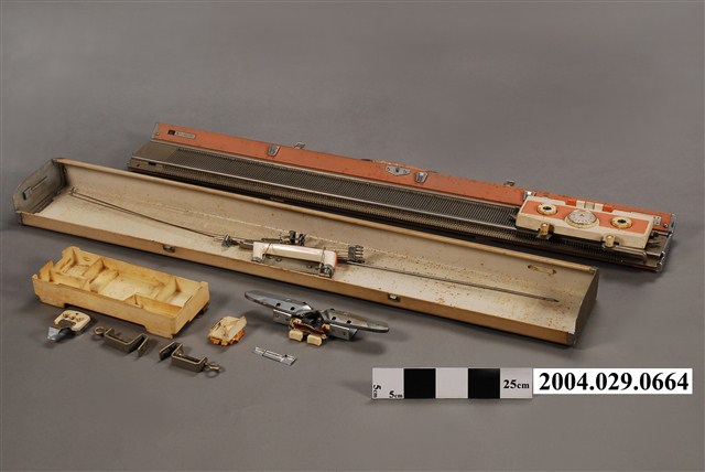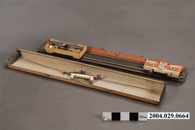 本物件為三菱織毛線衣機器,整體為扁平的長型物件,包含許多配件、金屬零件等。MITSUBISHI毛衣編織機,可編織各類毛衣及針織服飾產品的編織機器,主要採橫向雙針床,又分為手搖橫機、電動橫機、電腦附屬檔案機、 電腦橫機等機型。