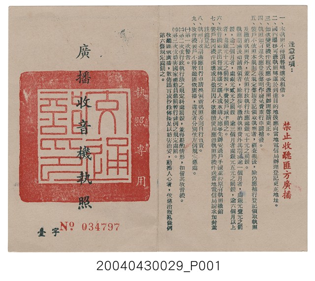 2004.043.0029 民國49年交通部臺北電信局發給謝力廣播收音機執照臺字第034797號