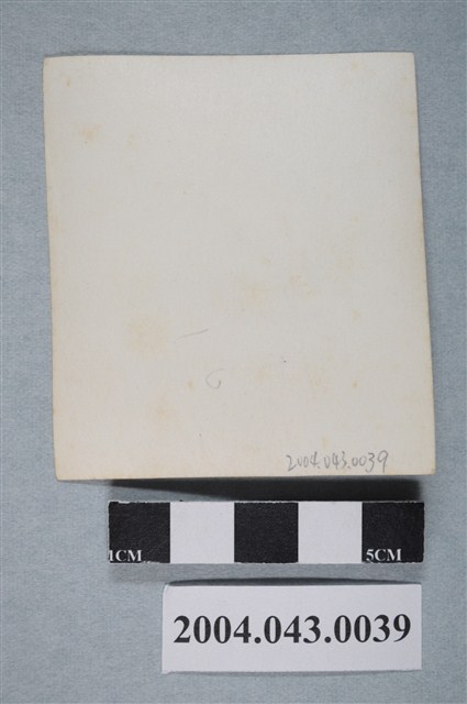 本物件為女子於涼亭獨照,為黑白照片,畫面中可見女子坐於涼亭椅,左手靠在一旁椅背,其身著淺色連身長洋裝及深色高跟鞋,望向鏡頭。此照片攝於戶外空間,可見後方樹木叢生,該涼亭樣式特別,僅中間作支撐,上方撐起圓形遮棚。