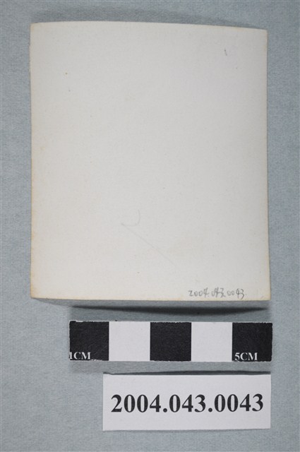 本物件為女子於石椅上獨照,為黑白照片,畫面中可見女子坐於磨石子材質的椅子上,其頭上有寬版髮帶,身著淺色平口連身長洋裝、小披肩向後,腳踩高跟鞋,一旁還有一只深色小提包,其左手向身後支撐,右手則拿著一副墨鏡,像畫面右側看去,並未直視鏡頭。此照片攝於戶外空間,後方可見草地、樹木,右側還有幾名男子身影。
