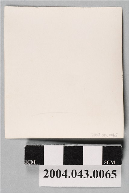 本物件為女子蹲姿獨照,為黑白照片,畫面可見女子留有一頭捲短髮,身著淺色上衣、外套、深色長裙,手肘則撐在膝蓋上,望向鏡頭露出笑容,此照片攝於戶外空間,且為由上而下拍攝,女子身後有矮草叢,遠景可見建築,樹木。