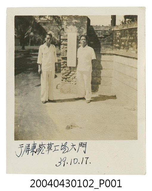 1.本物件為2名男子於屏東菸草工場大門合照,為黑白照片,可見畫面中有2名男子,右者身穿短袖白衣,白色長褲,左者身穿長袖白衣,白色長褲,皆站於1道石牆前,石牆未完整連接,於畫面中央為開口處,掛有1條看牌但無法辨識字樣,相片下方有「于屏東菸草工廠場大門」、「39.10.17.」黑色字樣。