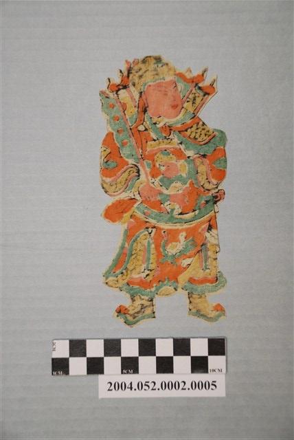 門神版印彩紙為一對兩件(2004.052.0002.0005、2004.052.0002.0006),本件門神彩紙為左神,門神作少年模樣,臉上無鬚,古代武將裝束,身穿盔甲,背後「背五峰」帶五面旗子,表示有統神兵之職司,屬武將門神。門神左手持一面旗子,背後旗幟中有一「英」字,與右件門神背後旗幟中的「記」字合為「英記」,為版畫作坊商號。