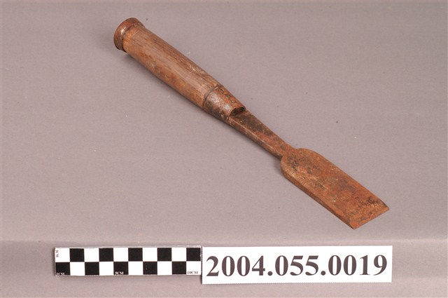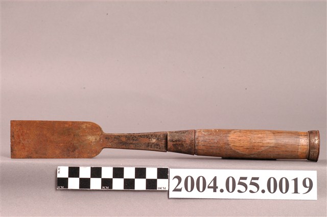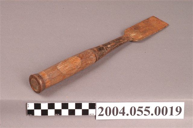 為木工工具,為鑿刀,又稱鑿仔。在建築匠師的工別上,大木、鑿花都會用到鑿刀,家具匠師也會使用。通常與鎚配合作業。鑿刀通常由刀片、刀柄、鐵環三種構件組成。若不必搭配鎚的細部作業,則鑿刀不必在刀柄尾端加鐵環。可依刀口形狀不同,分為圓口與平口兩類,本件為平口鑿刀。刀片為鐵,刀刃材質為鋼,刀柄木製,鐵環用以固定刀柄端。鑿刀用以削木、鑿洞、作榫等作業。木作匠師常購買刀刃,再自行製作刀柄製成鑿刀。近期工具店亦販賣成品。鑿刀的尺寸以刃口長度做區別,本件刃口長度3.5cm,為1寸2分鑿刀。