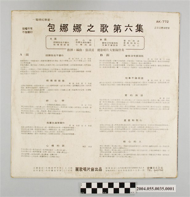 本件保存良好,為包娜娜所演唱的回頭我也不要你黑膠唱片,麗歌唱片公司發行,A面收錄回頭我也不要你、癡情恨悠悠、碎心戀、我要永遠等著你、心裡的話,B面收錄當作沒有愛過我、往事不堪回首、愛的旅途、星星知我心、痴心的人。