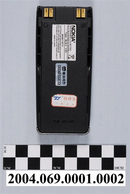1.本物件為NOKIA手機鋰電池,共四副,此為其中一副,裝於手機背蓋內。背面為黑色,內側有其製造資訊貼紙,但字體過小難以判讀,整體保存完整。