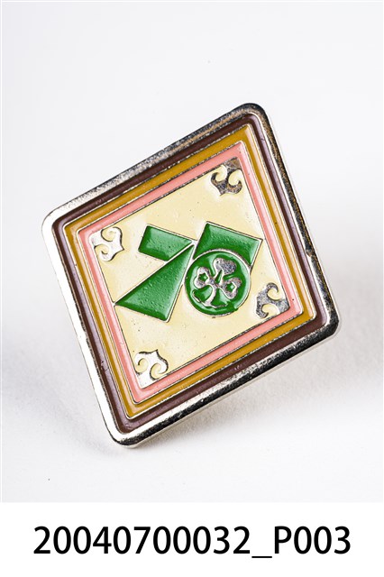 本件為中華民國女童軍紀念章,金屬材質,正面有三葉草圖樣及「75」字樣(按:應指團次),背面附有章扣。中華民國女童軍總會於1958年創立,地點位於臺北市,1966年成為世界女童軍總會會員國,會徽圖案內的「尖端」象徵航針;「左右星形」分別代表規律和諾言;「三葉草」則代表和平、慈愛、和平。