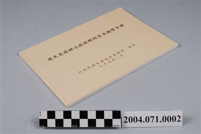 本物件為後天免疫缺乏症候群問答及聯繫手冊,為米色封面橫式A4大小,封面上方為標題「後天免疫缺乏症候群問答及聯繫手冊」,下方有發行日期及編印單位「八十九年一月」、「行政院衛生署疾病管制局編印」黑色字樣,皆為由左而右橫式書寫,內容為對愛滋病的問答,包含帶滋病的基本介紹、傳染方式、檢疫方式、治療方法、預防方法等。附錄為衛生署防治指定醫院電話及官方單位、民間團體防治業務承辦人聯絡方式,封底亦為米色,無字樣。