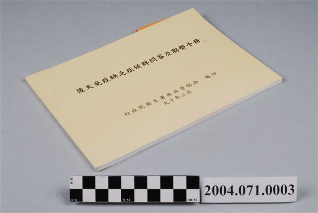 本物件為後天免疫缺乏症候群問答及聯繫手冊,為米色封面橫式A4大小,封面上方為標題「後天免疫缺乏症候群問答及聯繫手冊」,下方有發行日期及編印單位「九十年二月」、「行政院衛生署疾病管制局編印」黑色字樣,皆為由左而右橫式書寫,內容為對愛滋病的問答,包含帶滋病的基本介紹、傳染方式、檢疫方式、治療方法、預防方法等。附錄為衛生署防治指定醫院電話及官方單位、民間團體防治業務承辦人聯絡方式,封底亦為米色,無字樣。