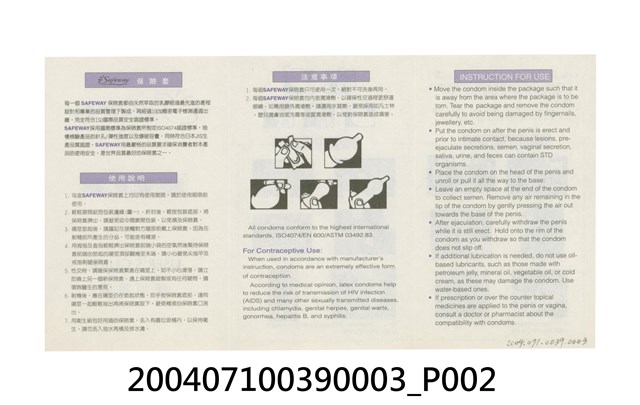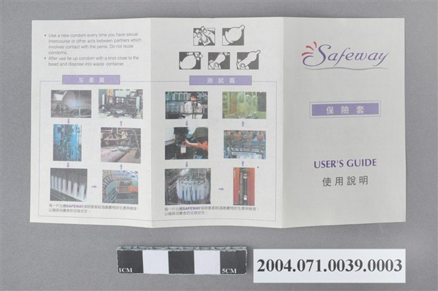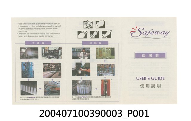 本物件為數位保險套使用說明。使用說明為摺頁型式,內容印有產品說明、使用說明、注意事項,以及保險套生產和測試過程圖片。