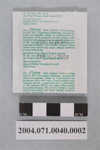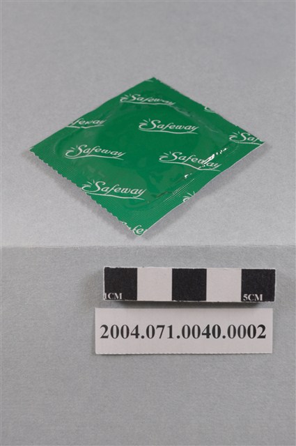 本物件為數位保險套。包裝為正方形,一面為綠色,因有Safeway字樣。另一面為白色,標示為全英文,有產品說明、製造商資訊和過期日期等。