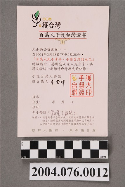 2004.076.0012 守護臺灣大聯盟頒贈「百萬人手護臺灣證書」