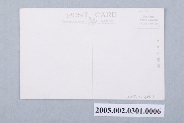 2.正面黑白印刷,由上、下二張圖組合而成,印有黑色說明文字「私立淡水高等女學校、割烹室、籠球コート」。背面則印有灰色文字「郵便はかき、POST CARD、Correspondence、Address」,地址欄與通信欄分隔線上有飛馬商標圖案,郵票張貼方框內有「Postage、2 Sen domestic、10 Sen foreign」等字。背面殘留有黑紙黏著痕跡,部分字被覆蓋。