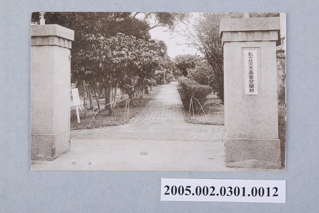 1.私立淡水高等女學校發行之「私立淡水高等女學校」明信片組之一,黑白印刷,由淡水李玉麟攝影、臺北岡部印刷,圖像內容為私立淡水高等女學校的校門口,右側門柱上刻有校名「私立淡水高等女學校」。