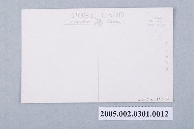 2.正面滿版印刷,下方印有黑色說明文字「正門」。背面則印有灰色文字「郵便はかき、POST CARD、Correspondence、Address」,地址欄與通信欄分隔線上有飛馬商標圖案,郵票張貼方框內有「Postage、2 Sen domestic、10 Sen foreign」等字。