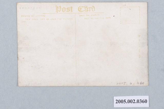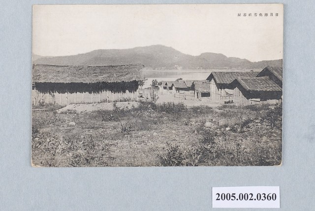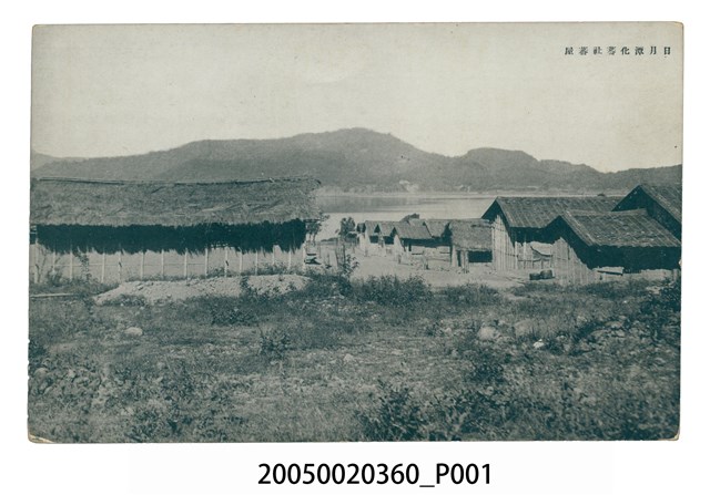 1.雙色印刷明信片,影像內容為日月潭湖畔邵族居住的部落,建築皆以竹子與茅草搭建而成,屋舍整齊且有序地排列,推測可能為1934年興建日月潭水庫舊社被淹沒、邵族人被遷移至卜吉社(Barawbow)以後經日本人規劃後的部落景象。 2.正面黑白影像滿版印刷,上方印有黑色說明文字「日月潭化蕃社蕃屋」。背面則印有黃棕色文字「郵便はかき、POST CARD 、PRINTED BY JYCMOKU」等字,及郵票黏貼方框。