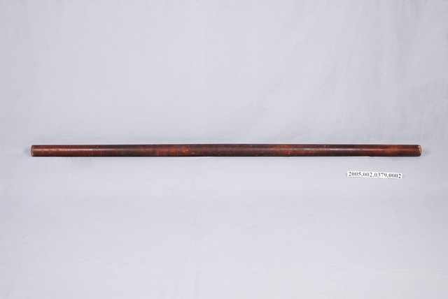 本件為樹仔腳錦樂軒鼓架之長棍,木頭製作圓柱體,功用為貫穿鼓架頸部的兩圓孔,一前一後使人肩扛方便移動,兩端有些微磨損痕跡。