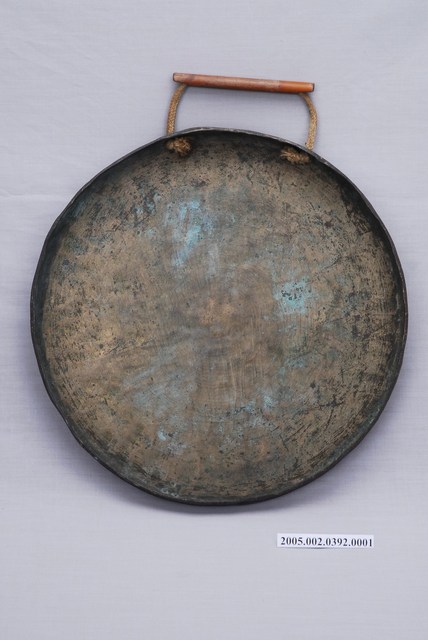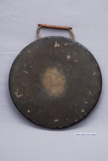 3. 鑼的大小尺寸多樣,使用場合也非常廣。大型鑼(直徑達1公尺以上)通常懸掛於鑼架上,以包有橡膠或棉布的鑼錘擊奏,常用於鼓吹樂、戲劇後場、導迎性的儀仗樂隊。小型鑼(直徑為50公分以下)則用於鑼的邊緣鑿洞穿繩,由演奏者懸提,並以木棒擊奏,常用於戲劇或法事後場演奏。羅和鼓為華人民間樂團中經常彆列的兩件重要樂器。民間慶典或戲劇都少不了鑼鼓烘托熱鬧的氣氛,因而有""鑼鼓喧天""的形容詞。本物件樣式為中心有突出鑼心的形制。