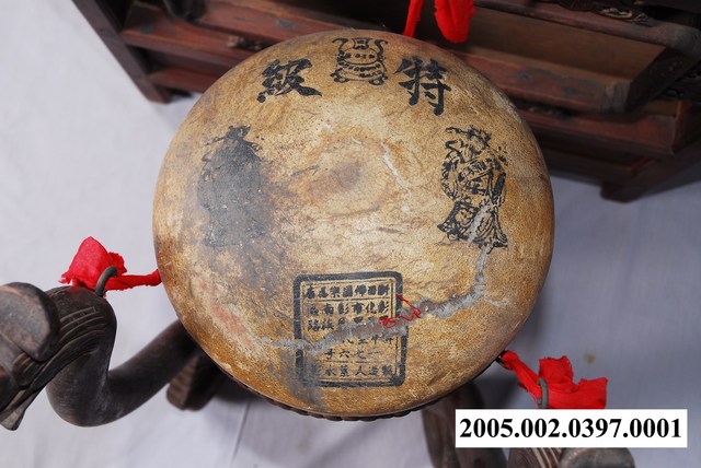 本物件為小鼓,鼓面為黃色牛皮,鼓面四周有數顆鉚釘釘製於上,並在鼓面最上方印有「特級」字樣,還有製造公司商標,中間兩側各有1尊神尊圖案,最下面還有1方形印戳,裡面寫有製造公司名稱及地址,隱約可以看出「彰化市彰南區…」等字樣,唯因為鼓面斑駁、顏色脫落,故圖案及字體有些不清楚,鼓架為木製,並以紅色布繩將鼓綁於架上。