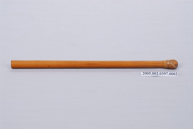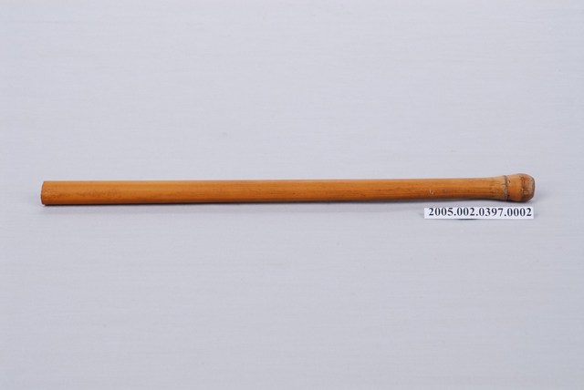 本件為鼓棒,竹子製作,鼓棒呈現淺咖啡色,功用為敲擊拍鼓使用,使鼓鳴共振發出聲響,與登錄號2005.002.0397.0003為同一對鼓棒。