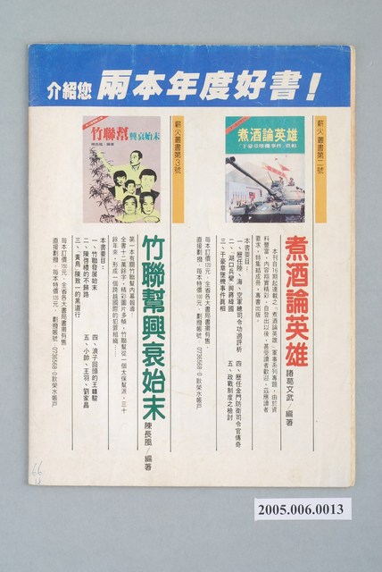 彭琳淞,2007。自由‧民主‧本土‧臺灣――看臺灣戒嚴時期的政論雜誌,全國新書資訊月刊,105:30-40 。黨外雜誌,文化部臺灣大百科全書,http://nrch.culture.tw/twpedia.aspx?id=2301(瀏覽日期:2019/11/05)。蕭淑玲,2006。臺灣黨外雜誌對黨外運動的作用(1979~1986)—以《八十年代》系列、《美麗島》、《蓬萊島》系列兩大路線為例。桃園:中央大學歷史研究所碩士論文。