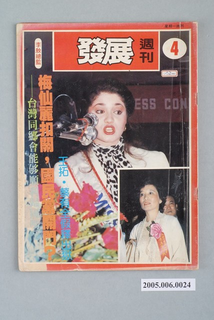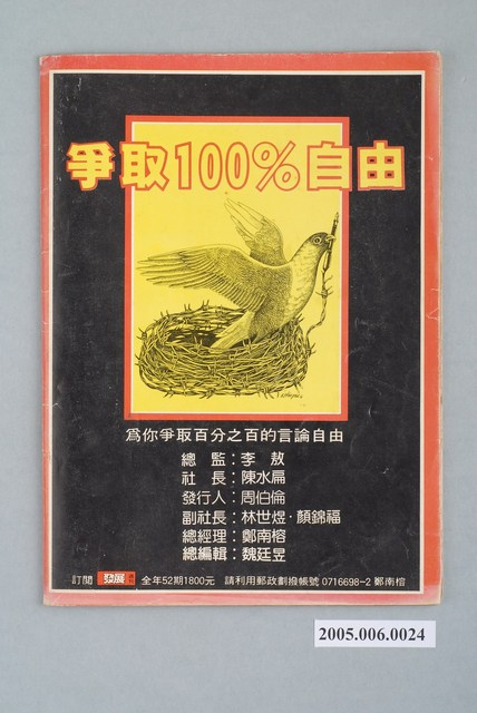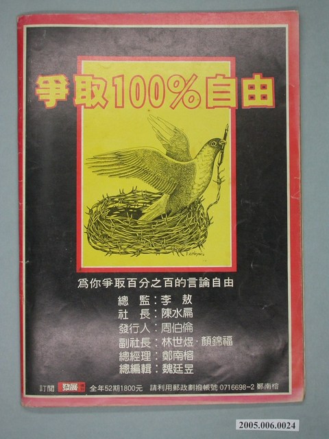 此為自由時代雜誌社1984年12月3日出版的《發揚》週刊第4期,內容計有〈從殺人滅口到抓人脫罪〉(李敖)、〈掃黑真相大白!-從陳啟禮涉嫌江南命案談起〉(江楓)、〈國民黨明年選舉看李煥!?〉(鄭智仁)、〈國民黨部S-95式的文宣策略〉(李江梅)、〈楊金欉換成許水德-院轄市長是內閣改組的關鍵〉( 沈勝衣)、〈李敖給九家報社的公開信〉(李敖)、〈黃信介將出庭應訊?-記馮滬祥控告蓬萊島的開庭辯論〉(許主峰)、〈言論自由戰-黨外立委對上張京育〉(沈明)、〈家的元首能,我們的元首不能!-評論新聞局長張京育的談話〉(王鎮輝)、〈黨外公政會就是要促進組黨!-訪費希平委員〉(何思)等。 此物件為鄭南榕所創辦的《自由時代》系列雜誌之一。由於意識到出版審查之嚴峻,鄭南榕在刊物創辦之初便註冊了為數眾多的「時代」系列標題,以免後續因遭查禁而無法準時出刊,另《自由時代》為保護相關供稿者,鄭南榕主動承擔《自由時代》一切文責,且不在雜誌目錄頁著錄個別作者姓名。《自由時代》標榜著「爭取百分之百的言論自由」,致力於追蹤黨國內幕、打破禁忌話題,也籌劃街頭社會運動――如「五一九綠色行動」。《自由時代》訴求黨外組黨,在民主進步黨成立後則主張群眾路線,對於較保守的公職路線則加以批判。 「黨外」一詞主要為非中國國民黨的臺灣政治勢力,而「黨外」政治勢力,主要的宣傳方式為「黨外雜誌」,「黨外雜誌」最早如1950年代的《自由中國》、1970年代的《大學》、《臺灣政論》,後在1980年代「黨外雜誌」發展蓬勃,代表刊物為《八十年代》與《美麗島》,最終,這股媒體趨勢在1986年民進黨成立、1987年解除戒嚴之後逐漸式微。「黨外雜誌」在當時激起了臺灣民眾的民主意識,也逐步促成了言論自由開放。(蕭淑玲,2006,153-155)。